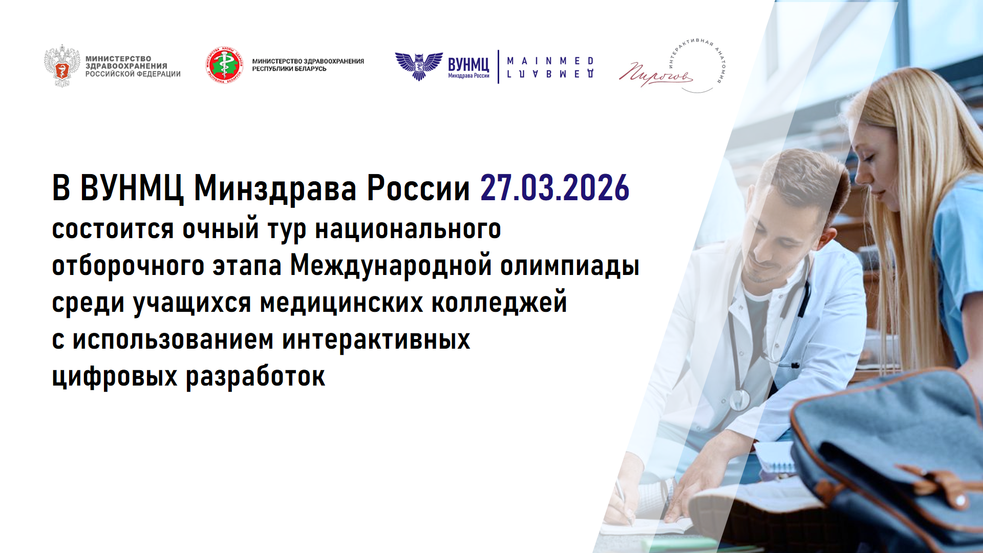 Мероприятие проходит по совместной инициативе Минздрава России и Минздрава Беларуси. Организаторами Международной олимпиады совместно выступают ВУНМЦ Минздрава России и компания «Развитие» — производитель анатомического стола «Пирогов».